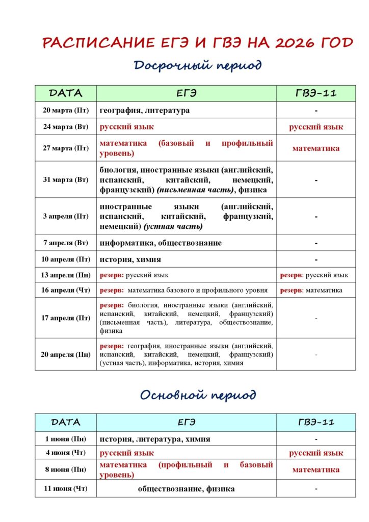 Для участников ГИА, а также для обучающихся СПО, обучающихся, получающих среднее общее образование в иностранных образовательных организациях, экзамены по их желанию могут проводиться в досрочный период проведения экзаменов. Для выпускников прошлых лет ЕГЭ проводится в резервные сроки основного периода проведения экзаменов.
